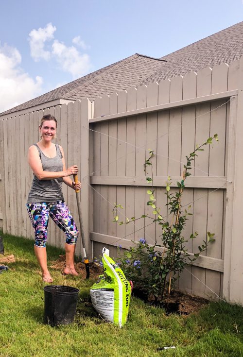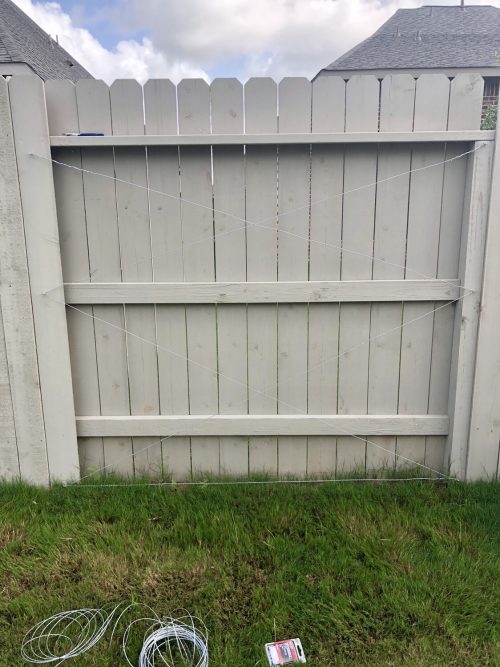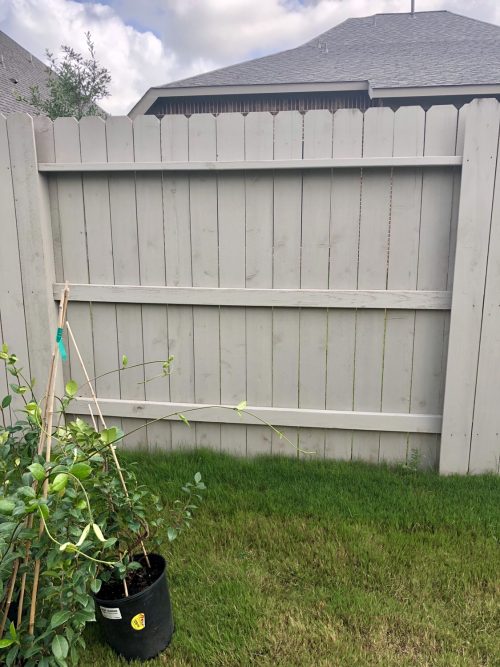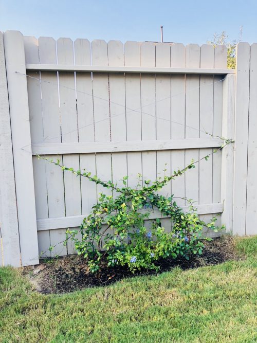 Depending on your climate, a traditional vine might not work due to heat and/or sun exposure. Be sure to consult your nursery to find the best plant for your yard. Being in Houston, it’s extremely hot and our fence is in the sun all day. I chose the Star Jasmine Vine, as it is great for our climate and smells gorgeous! Plant two vines off-center at the base of the fence. Then, carefully direct and wrap the vines around the wire guiding them up the trellis. Be sure to water them and continue to guide the vines as they grow up the trellis. In no time, you’ll have a gorgeous fence!