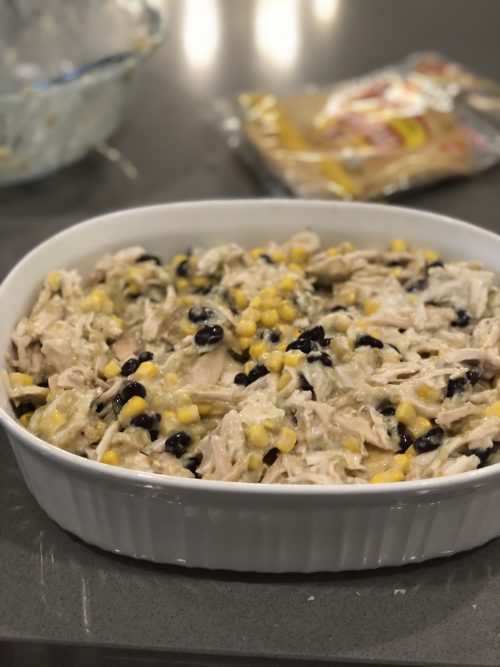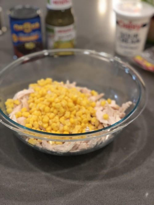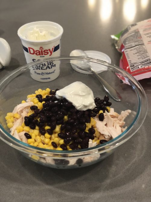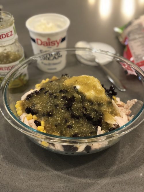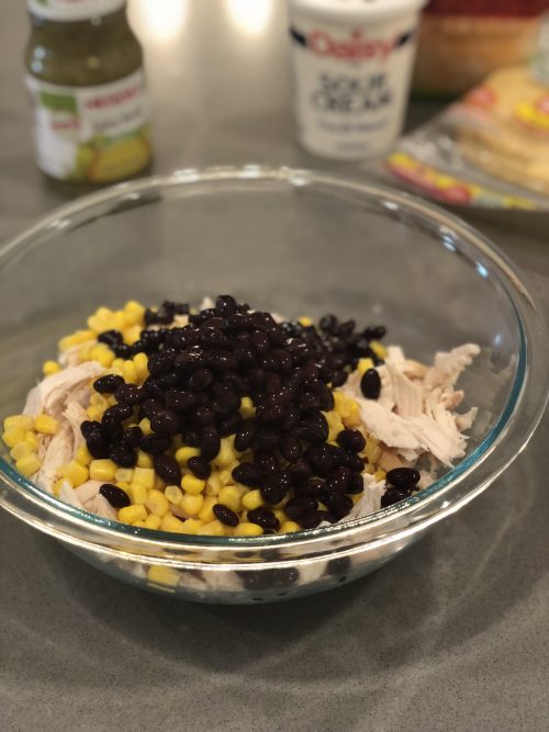 Combine Black Beans, Corn, Salsa Verde, Sour Cream with Chicken and mix.