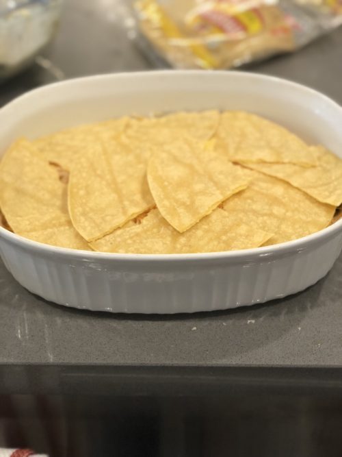 Tear the Corn Tortillas into 4 and place them at the bottom of the pan for the first layer.