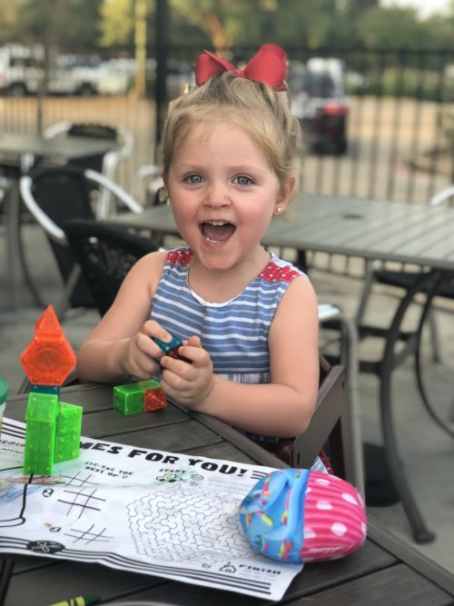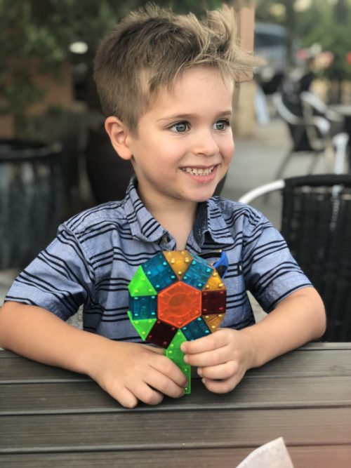 Out to dinner…no problem! We enjoy going out to dinner, however the kids eat so fast that they’re typically done before we’ve even gotten our meal. We used to hear the constant “Are you done? Can we go? I’m bored!” Thus, we have become so thankful for these awesome magnetic blocks! Now, they’re entertained through the entire meal! ??