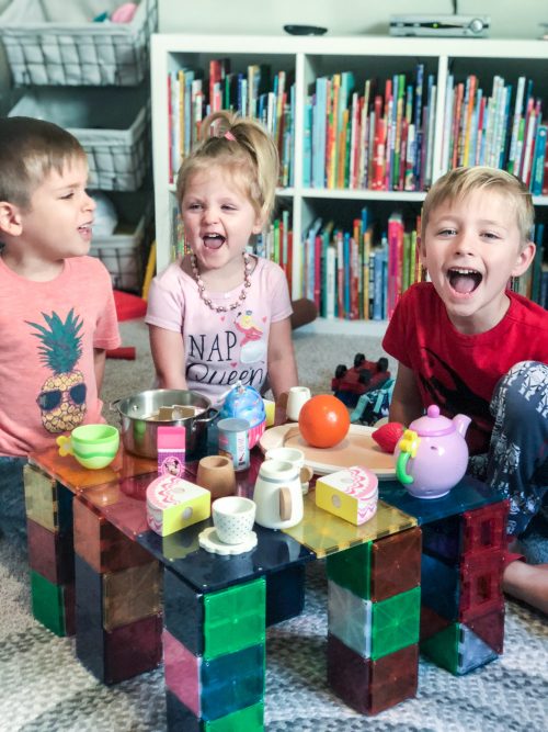 Tea Time…pretend play is always fun! Especially, when it involves Peppa Pig, Teddy, and Dinosaur, lol. We’ll often see the three of them having a tea party together. And nothing is better than a table made out of magna-tiles; love their creativity!