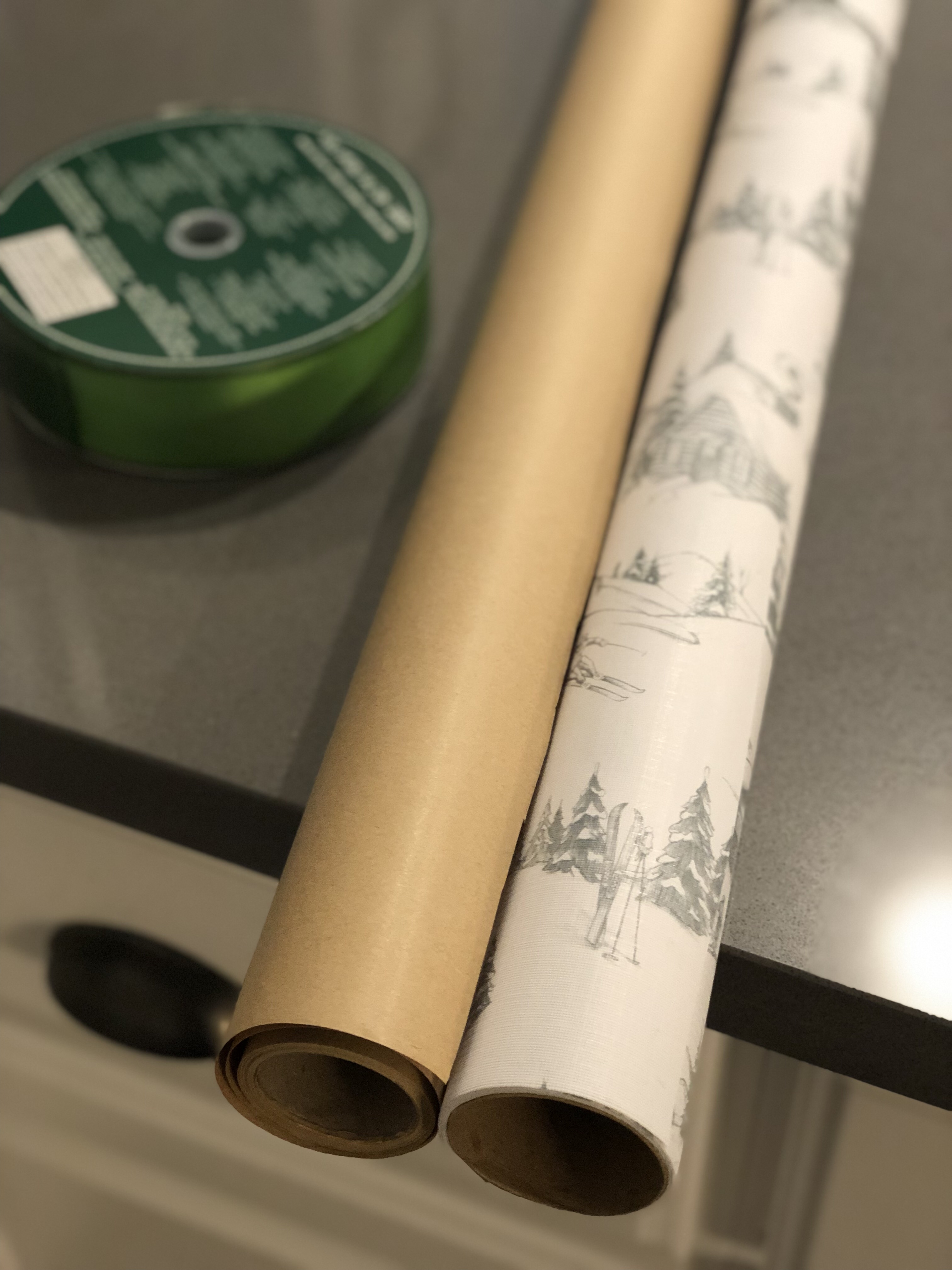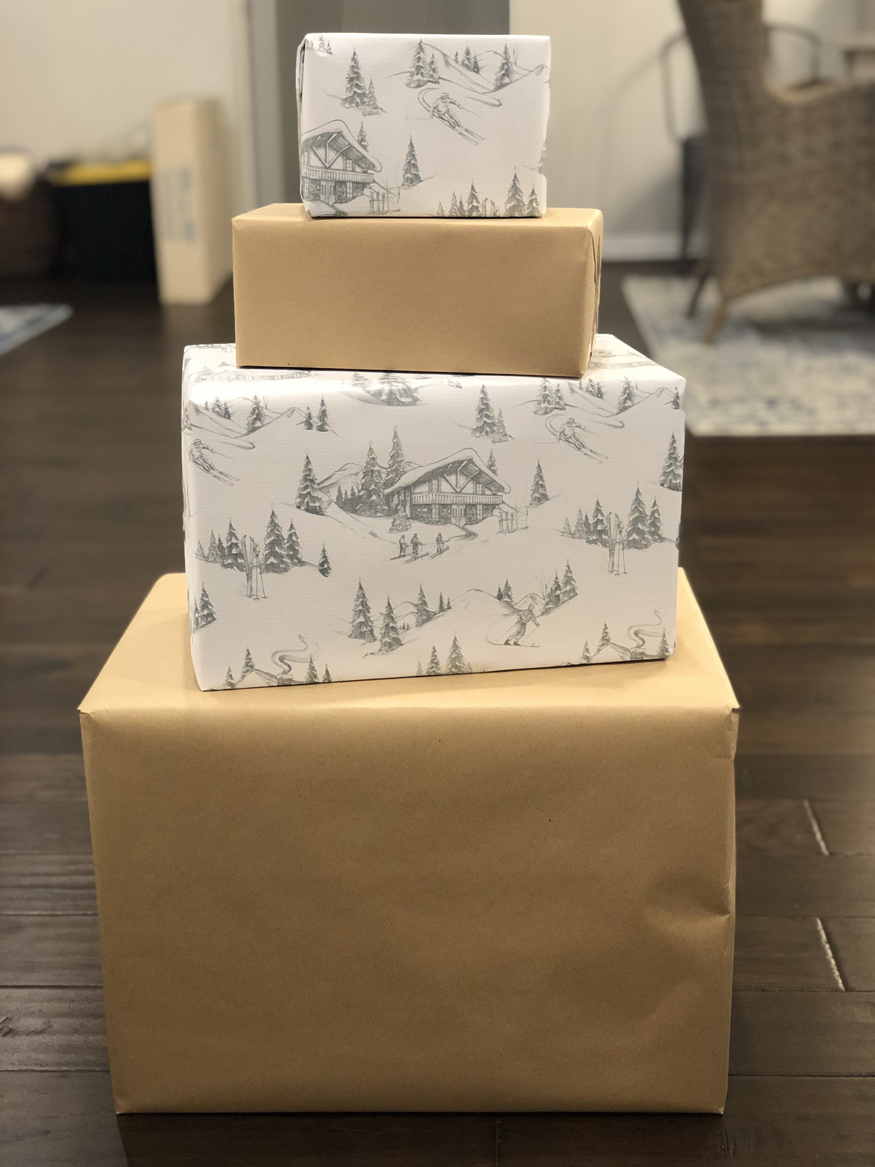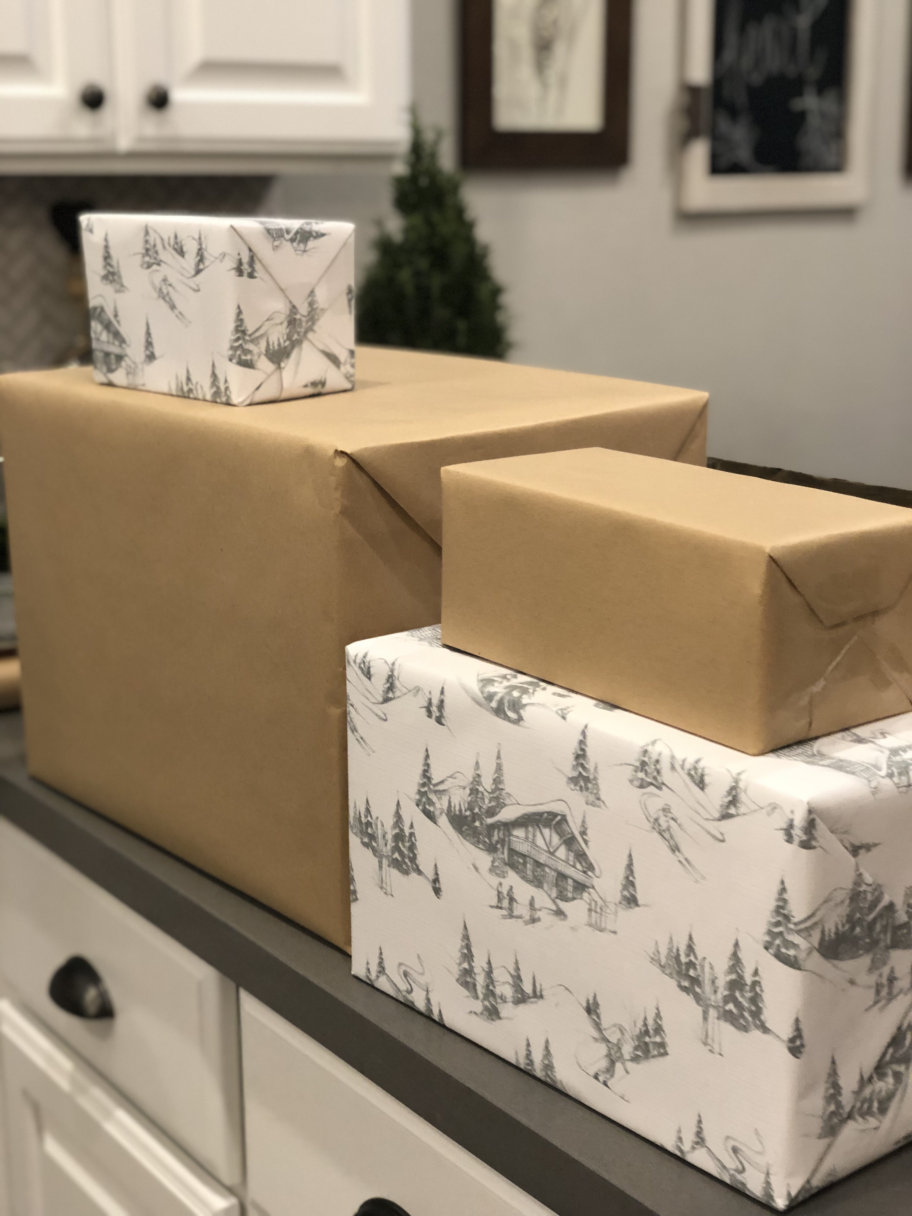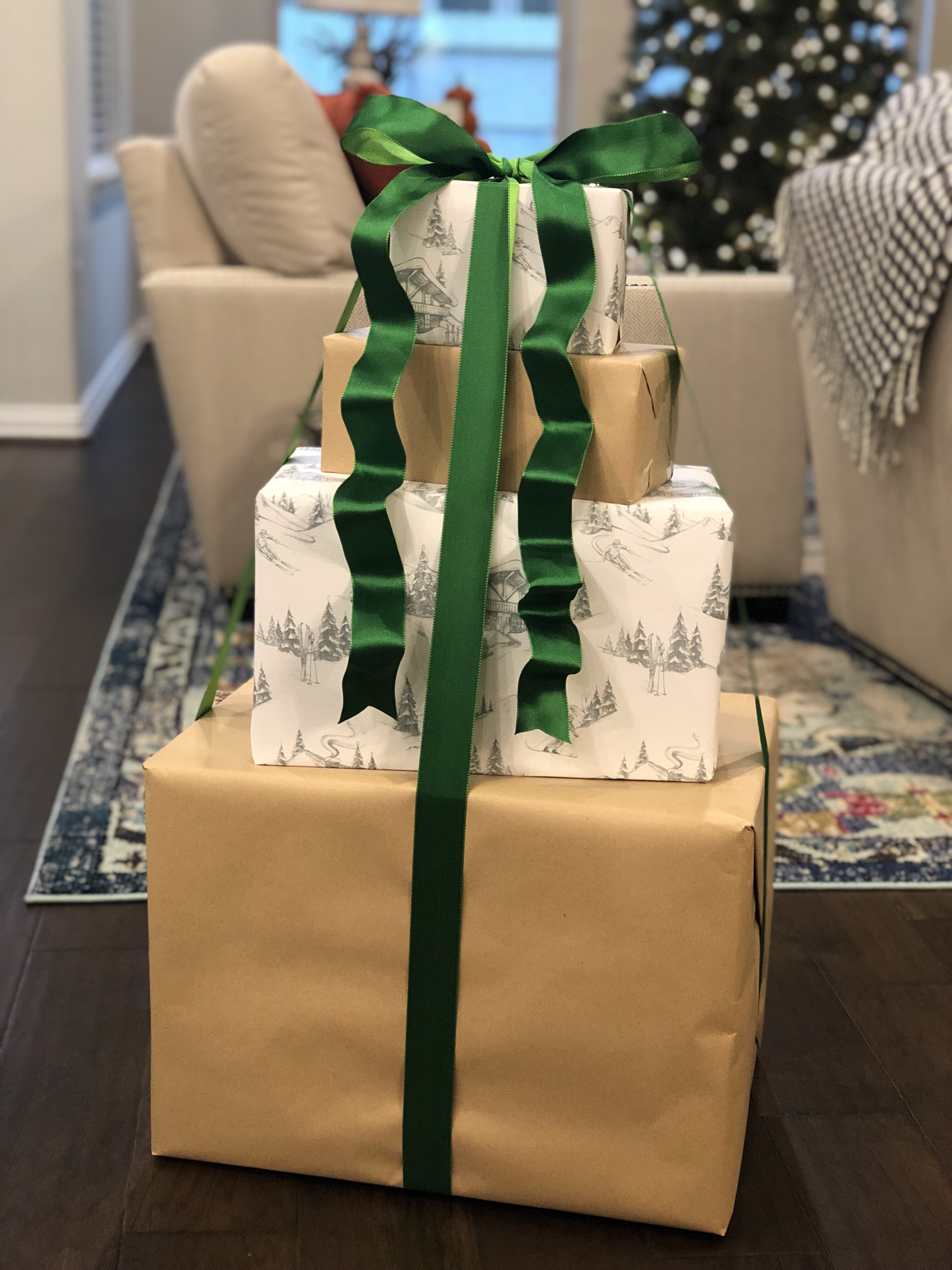 Today, I wanted to share an easy and affordable way to add some holiday decoration to your home.  I had set aside a couple empty boxes, which would normally go in recycling and instead, decided to make a gift tower.  I ventured off to HomeGoods and found wrapping paper with a more vintage look along with some green satin ribbon.  The entire project was less than $10 dollars and is a perfect addition to our fireplace decor.